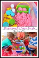 My oldest wanted to try some Strawberry scented sensory play this summer and I told him we could. We love fresh strawberries at my house. Playing with strawberry scented Ice Cream Dough seemed like a must! We set out to make a list of
