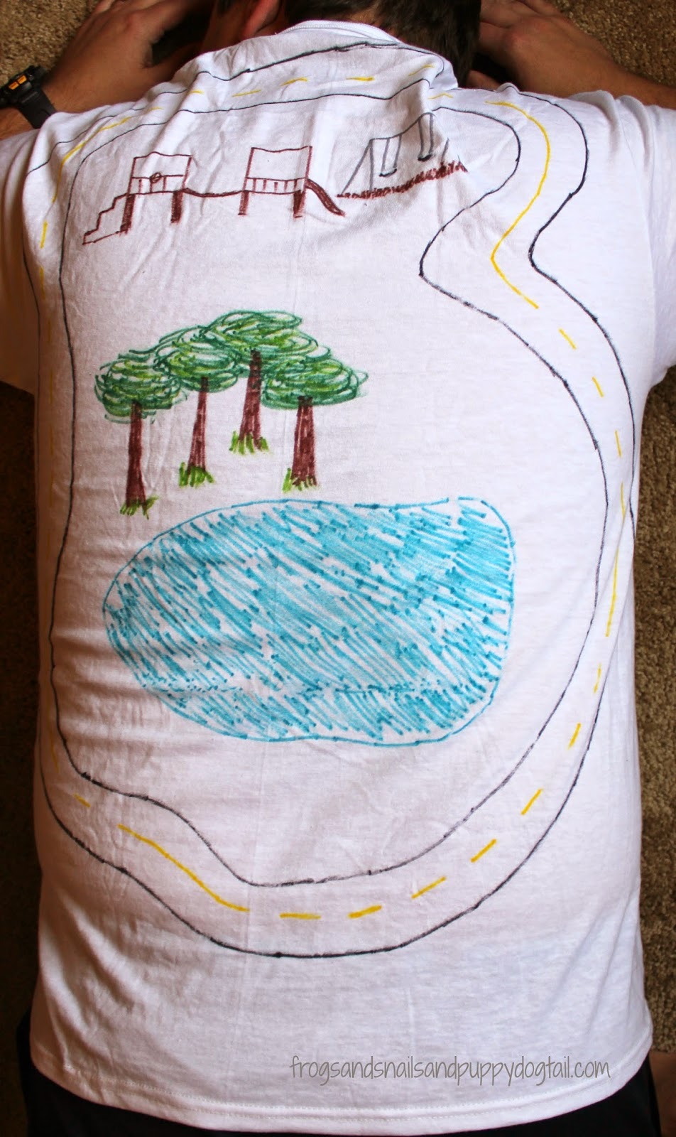 Use your favorite shirt, for us it is Fruit of the Loom® Men’s Sure Fit Crew Tees. Take permanent markers or fabric markers (sold at walmart too) and draw your own fun design on the back of the shirt. I put a cardboard box between the shirt to avoid the marker bleeding.