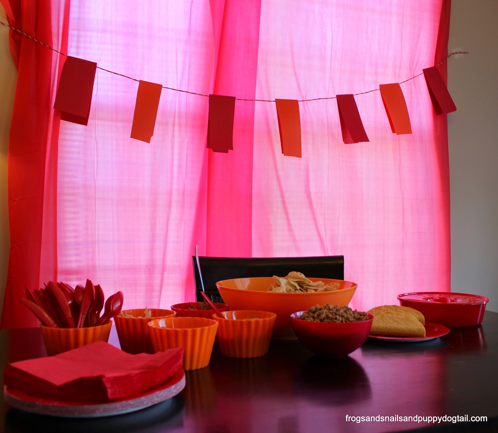 I got 2 red table cloths, paper plates and napkins, colored file folders, rope, and bowls at the dollar store. I used these items to help decorate for our taco dinner. I kept it simple.