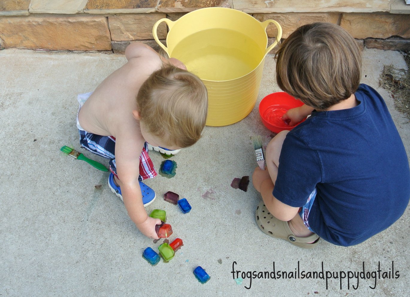 colored ice cubes( fill ice trays with water and food coloring and freeze. I leave these in my freezer at all times bc I never know when we are going to need them.), bucket of water, and paint brushes.